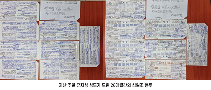 지난 주일, 우리 교회 사랑부 유지성 성도가 코로나19 사태로 인해 교회 출석하지 못한 지난 26개월 동안의 십일조를 모아서 한 번에 드렸습니다. 헌금 봉투마다 "하나님을 믿습니다"라는신앙고백과 자신의 기도제목, 교회에 대한 그리움, 사랑부 선생님에게 전하는 짧은 글 등 소박하지만 진솔한 신앙고백들이 빼곡히 적혀있었습니다. 그 글들을 통해 유지성 성도가 그동안 얼마나 교회에 오고 싶었는지 알 수 있었습니다.